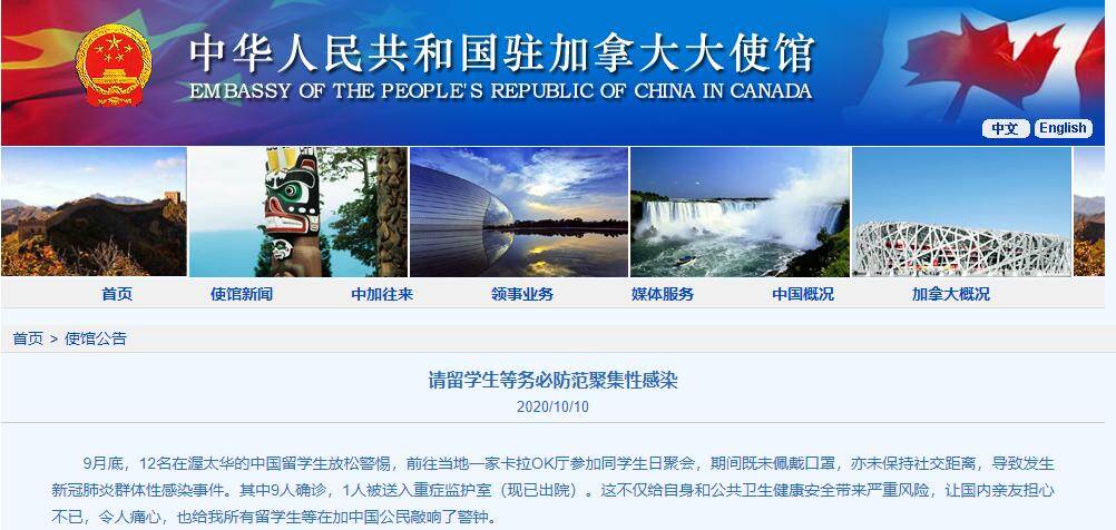 驻加拿大使馆称,9月底,12名在渥太华的中国留学生放松警惕,前往当地一家卡拉OK厅参加同学生日聚会,期间既未佩戴口罩,亦未保持社交距离,导致发生新冠肺炎群体性感染事件。其中9人确诊,1人被送入重症监护室(现已出院)。这不仅给自身和公共卫生健康安全带来严重风险,让国内亲友担心不已,令人痛心,也给所有留学生等在加中国公民敲响了警钟。