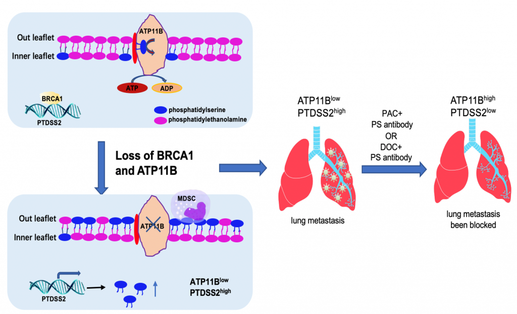 研究团队利用全基因组敲除文库技术完成对驱动基因的筛选,最终得出ATP11b为癌症转移的抑制基因。在基因组水准剔除ATP11b,不仅能够显著增加BRCA1突变乳腺癌细胞转移能力,且进一步表明ATP11b诱导非凋亡性的磷脂醯丝氨酸在细胞膜上外翻的机制,从而促进了对肿瘤微环境的修饰与预转移龛的形成。研究团队通过公共资料库调研与细胞验证的方式,确定了紫杉醇与多西紫杉醇能有效阻断与ATP11b关联的肿瘤转移。