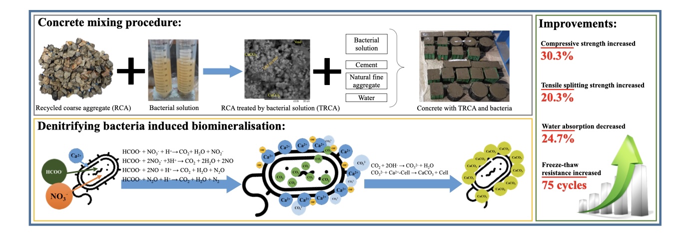 “再生粗骨料混凝土中的孔隙会被反硝化细菌产生的碳酸钙晶体填满,更密集的结构能降低冷冻水的膨胀效应。”