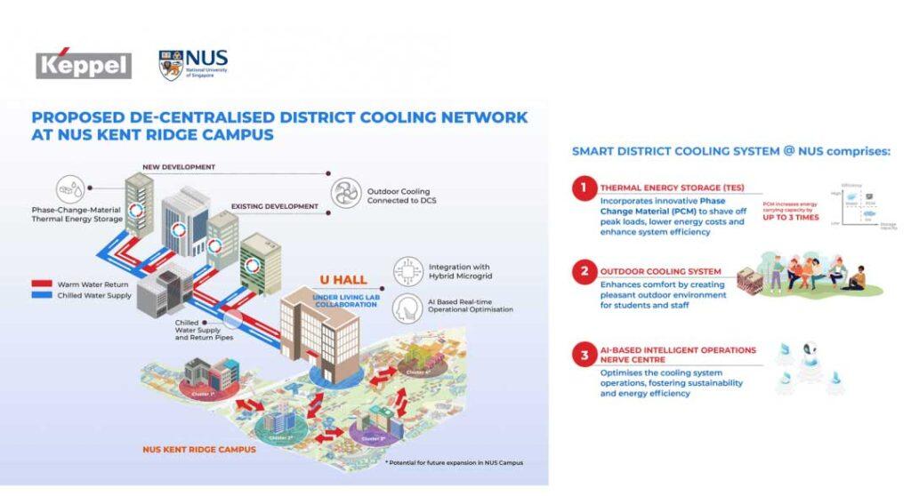 在双方签署的研究合作协议中,新加坡国立大学的科研人员与吉宝企业的工程师还将重点关注在新加坡国立大学大学堂及邻近地区开发“创新区域冷却系统”。在这一过程中,新加坡国立大学与吉宝企业在早期合作中联合研发得出的一项“基于材料的专有热能存储技术”,以及“采用室外空气进行冷却的技术”与“基于人工智能的实时优化技术”将被投入使用——这些技术将与“交直流混合微电网”集成,有望大幅减少新加坡国立大学的碳足迹以及冷却能耗。